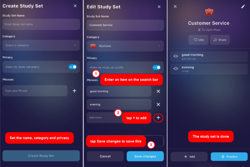 You can open the study set list to practice speaking all the sentences and words added. Make sure to tap on the red words to open the advanced feedback pop-up.