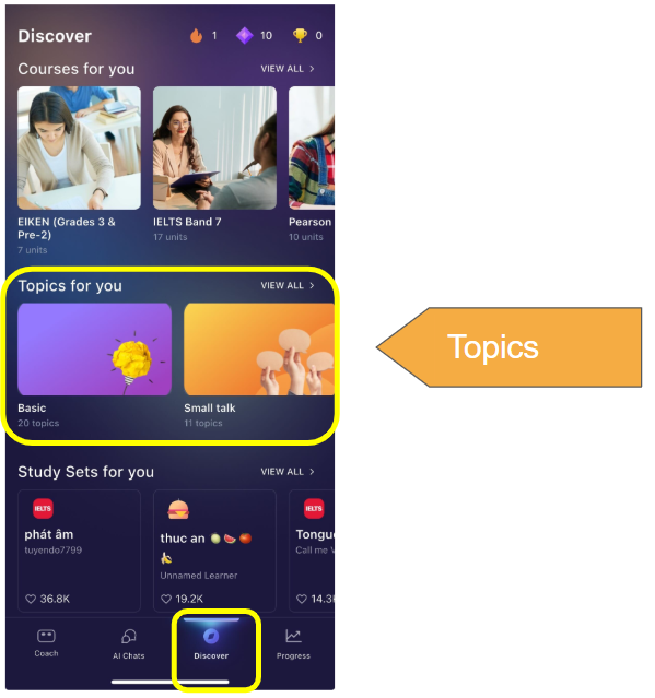ELSA lessons are categorized into different topics of interest such as Education, Entertainment, Business, etc. Each topic has many lessons in different skills and levels to practice pronunciation.