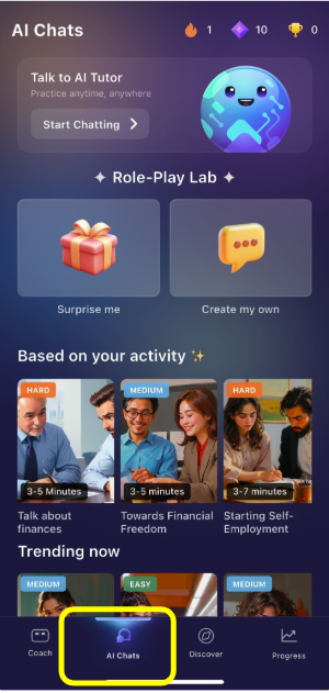 Experience a new way to master English with Roleplays and AI Chats, a feature designed to help you engage in free-flowing, spontaneous, and realistic conversations on nearly any topic or scenario imaginable.