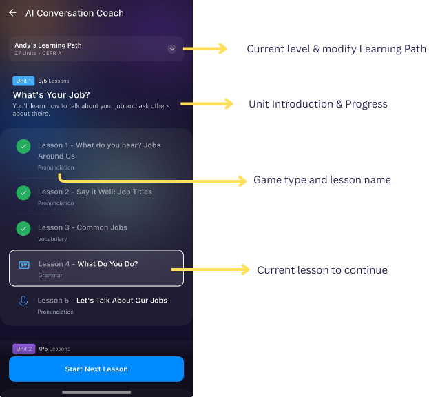 Learning Path is a personalized study plan created for you based on your English level, professional field, learning goals and interests.