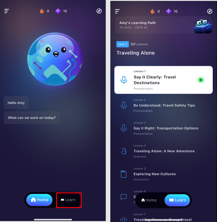 - Activities: Listen and repeat exercises; users can tap on words to get detailed pronunciation analysis.
