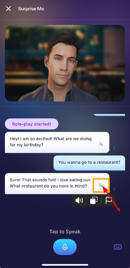 For A1 and A2 levels, the translation will always appear automatically. For level B1 and above, the translation are hidden and only show if you click on the translation icon.