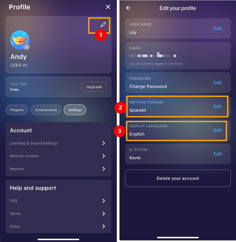 The Mother Tongue language is your native or preferred language, used for functions like bilingual mode (For A1 and A2 levels) and translation (if the display language is English).