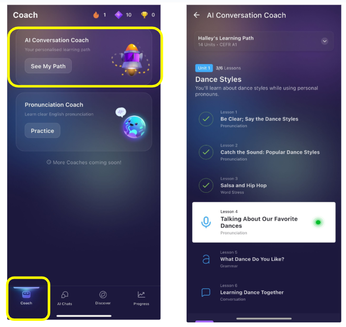 This is where you can find the AI Conversation Coach (your personal learning path) and the Pronunciation Coach for clear English practice.