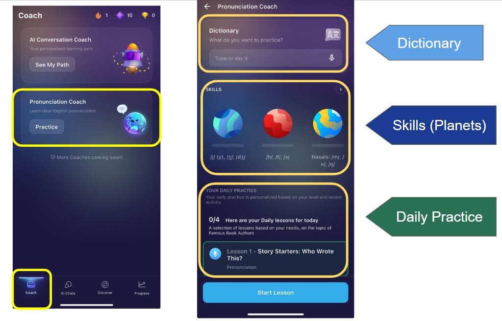 - Pronunciation Coach: The Dictionary, Skills (planets), and your Daily Practice are all located inside. You can find them by following these steps: