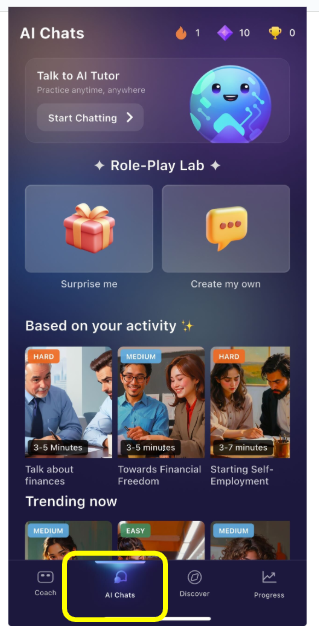 This is the new home for the AI Tutor and the Role-Play Lab to practice conversations and create your own scenarios.