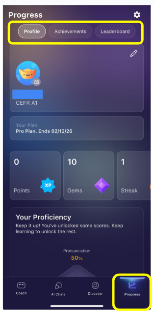 The Progress tab shows you how much you are improving in ELSA. At the top of this screen, you can easily switch between your Profile, Achievements, and the Leaderboard.