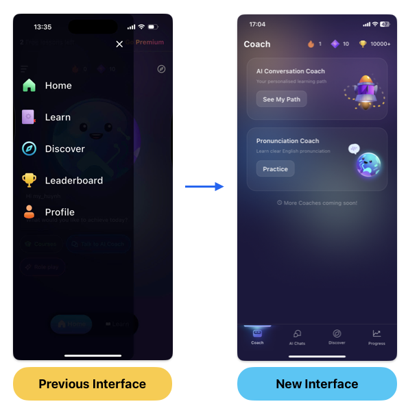 First, instead of tapping the Menu icon at the top of the screen to see all your options, you now have a clear navigation bar at the bottom with four main tabs: Coach, AI Chats, Discover, and Progress.