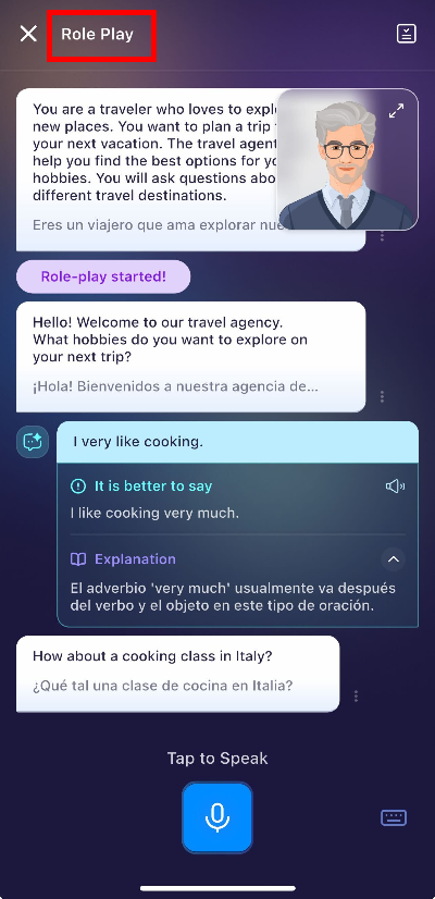 Tips: Look for the "Conversation" lessons (1) in Learning Path (located in AI Conversation Coach). Or go to AI Chats (2) and choose any AI Roleplay conversations.