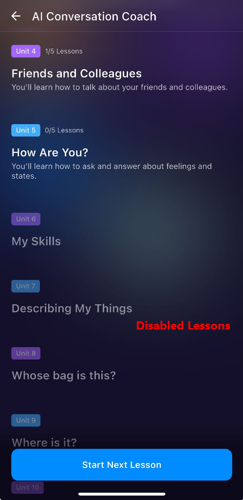 If you notice some lessons in the learning path are greyed or disabled. This is not a technical issue when the units and lessons are greyed out. This happens if you returned to an old and incomplete Learning Path.
