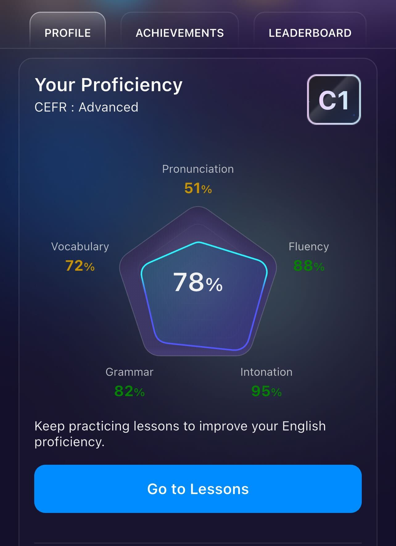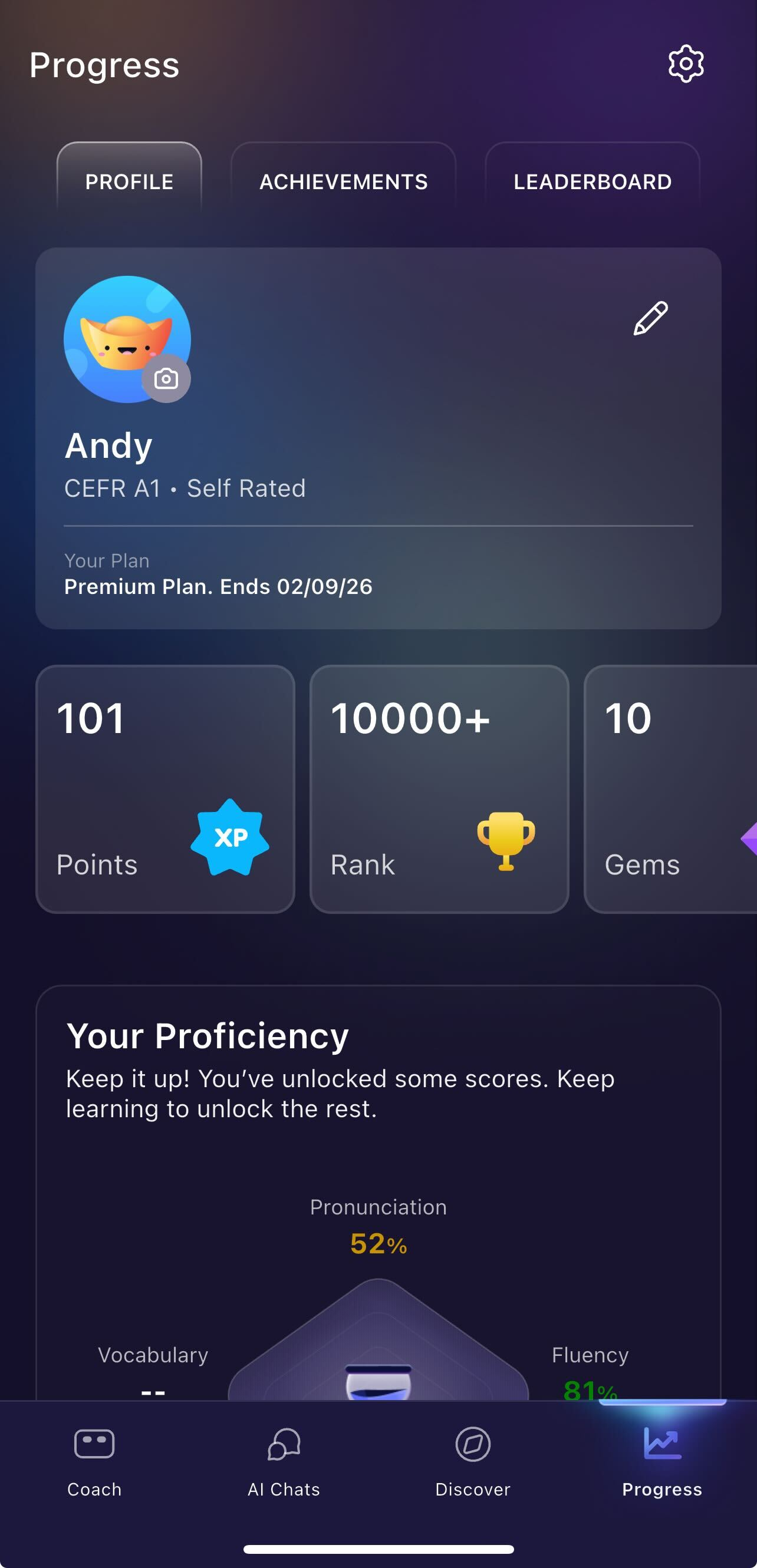 The Proficiency tab provides a detailed breakdown of your current language skills, helping you identify your strengths and areas for improvement.
