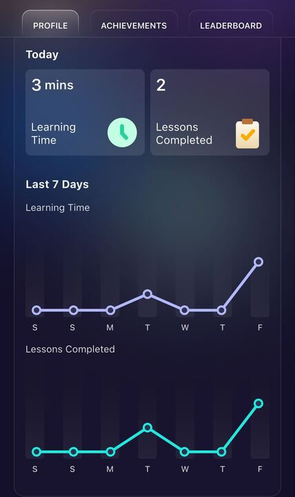 Lessons Completed Graph: Visualizes the number of lessons completed daily in the last 7 days.