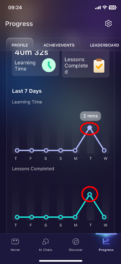 Note that you can click on the circle of each day to view the time and total lessons completed in that day. See picture below: