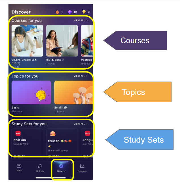 - Study Sets: These are lists of words or phrases you can practice. You can create your own sets or use sets made by the ELSA community to focus on the exact vocabulary you need.