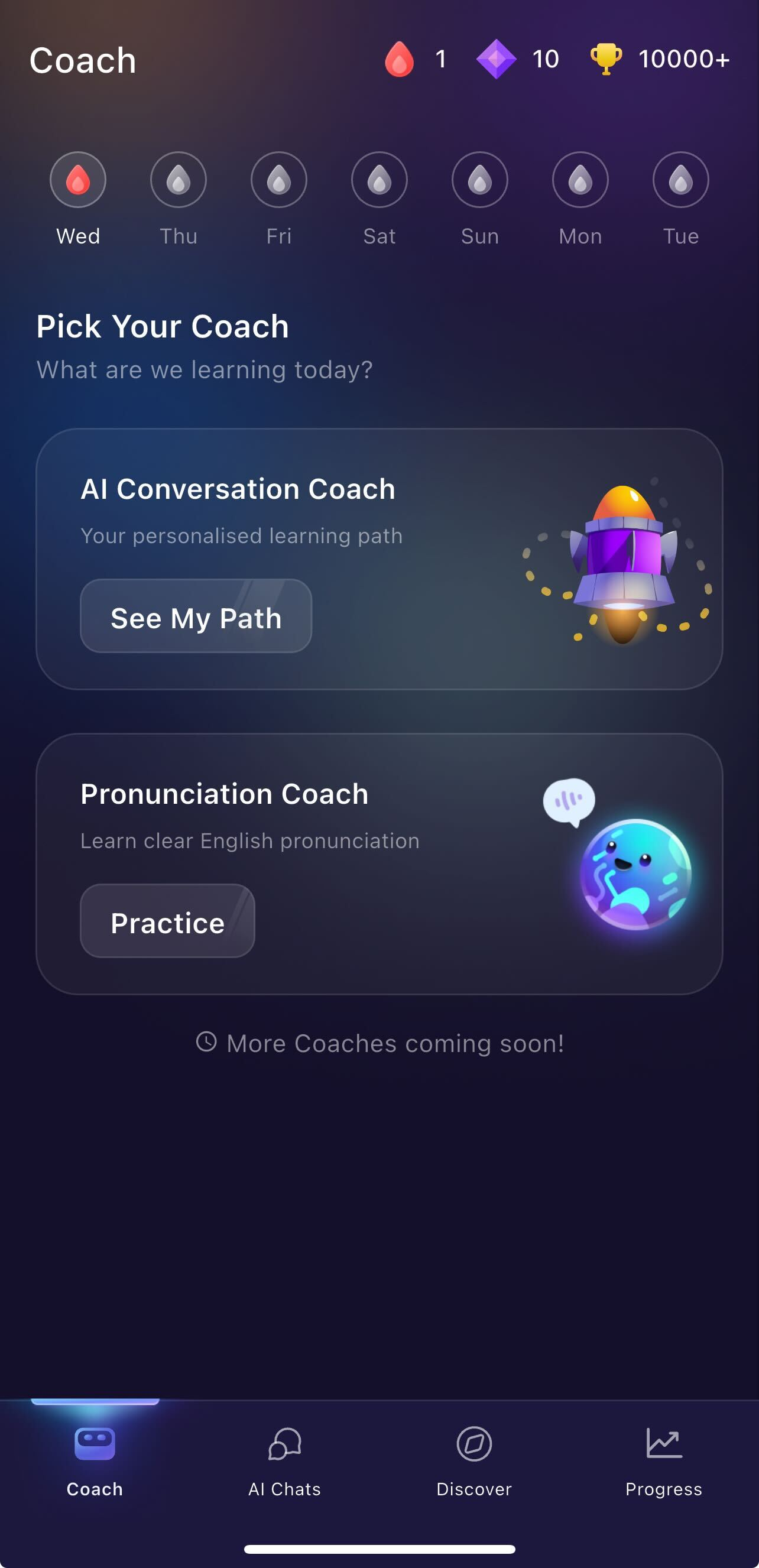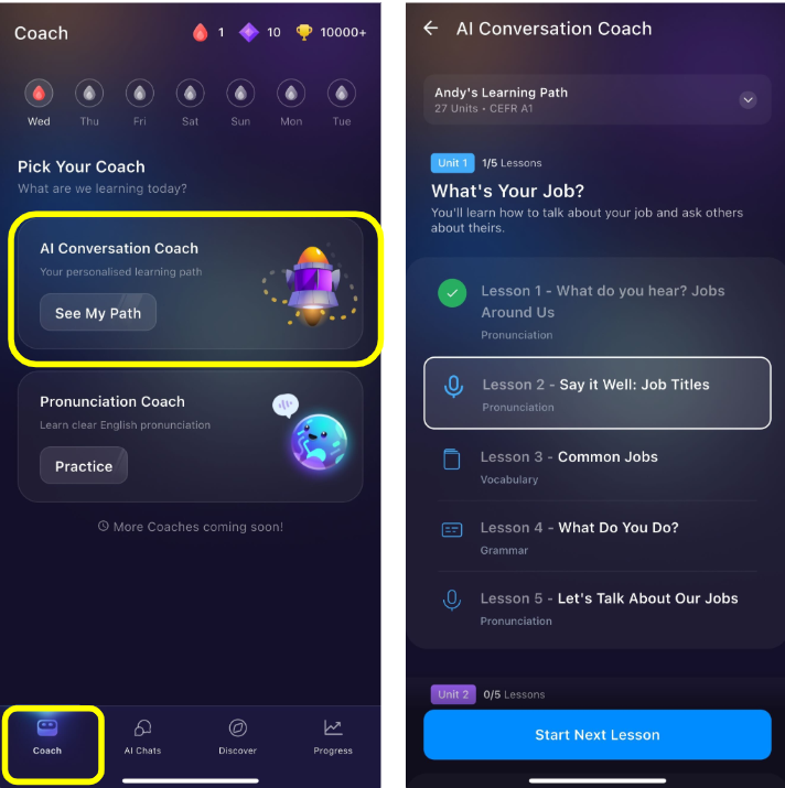 This is where you can find the AI Conversation Coach (your personal learning path) and the Pronunciation Coach for clear English practice.