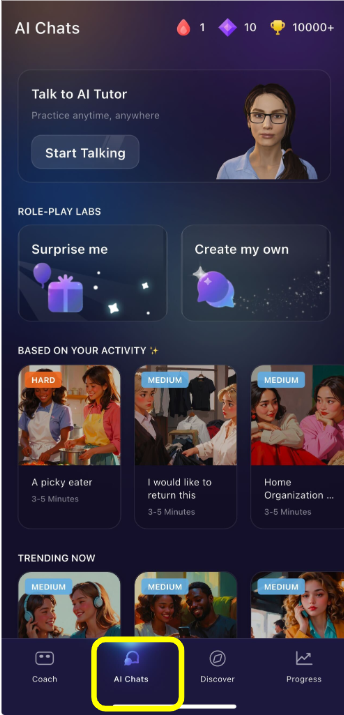 This is the new home for the AI Tutor and the Role-Play Lab to practice conversations and create your own scenarios.