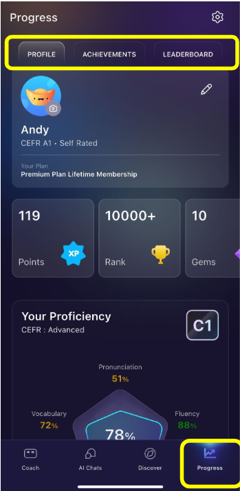The Progress tab shows you how much you are improving in ELSA. At the top of this screen, you can easily switch between your Profile, Achievements, and the Leaderboard.
