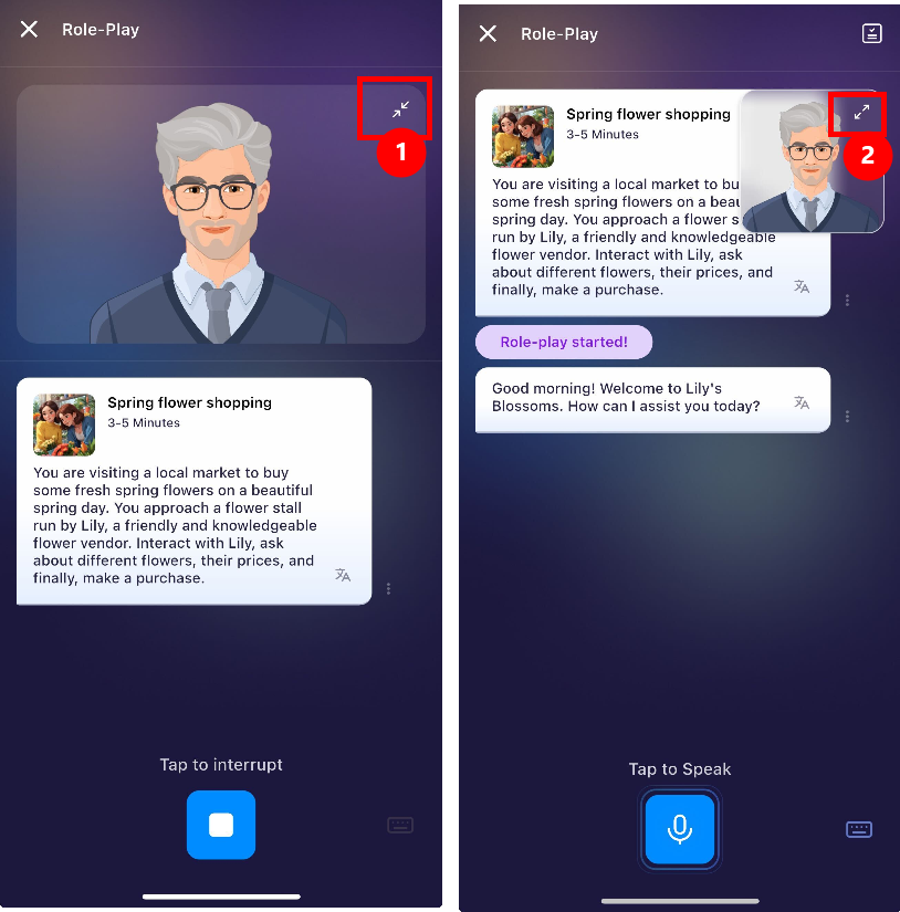 Ahora puedes ajustar el tamaño del avatar de IA durante tus lecciones para liberar más espacio en tu pantalla. Ten en cuenta que esta función está diseñada específicamente para lecciones impulsadas por IA y no está disponible para los ejercicios estándar.