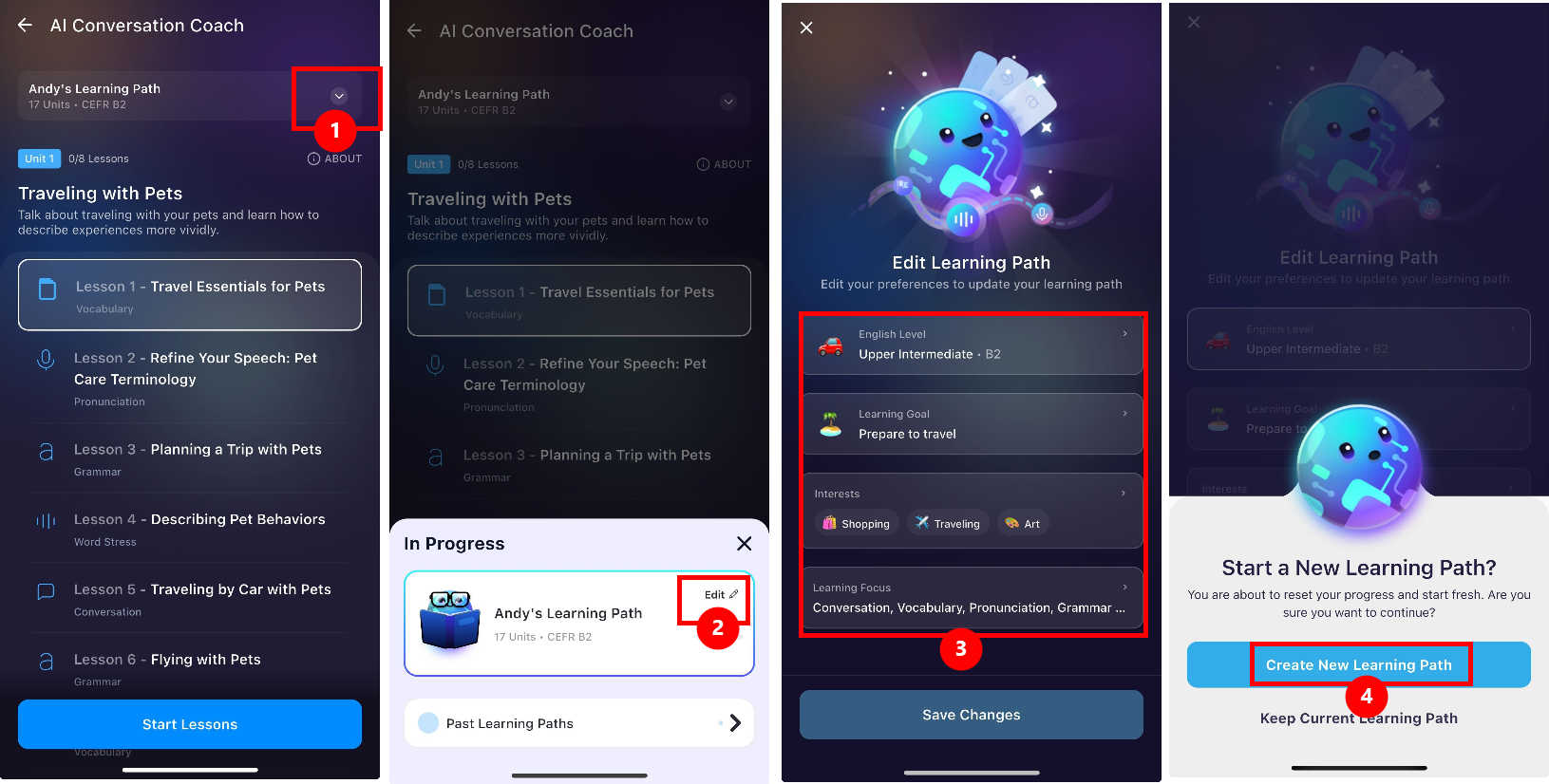 Fitur Jalur Pembelajaran Sebelumnya memungkinkan Anda melacak seluruh riwayat belajar Anda di dalam AI Conversation Coach.