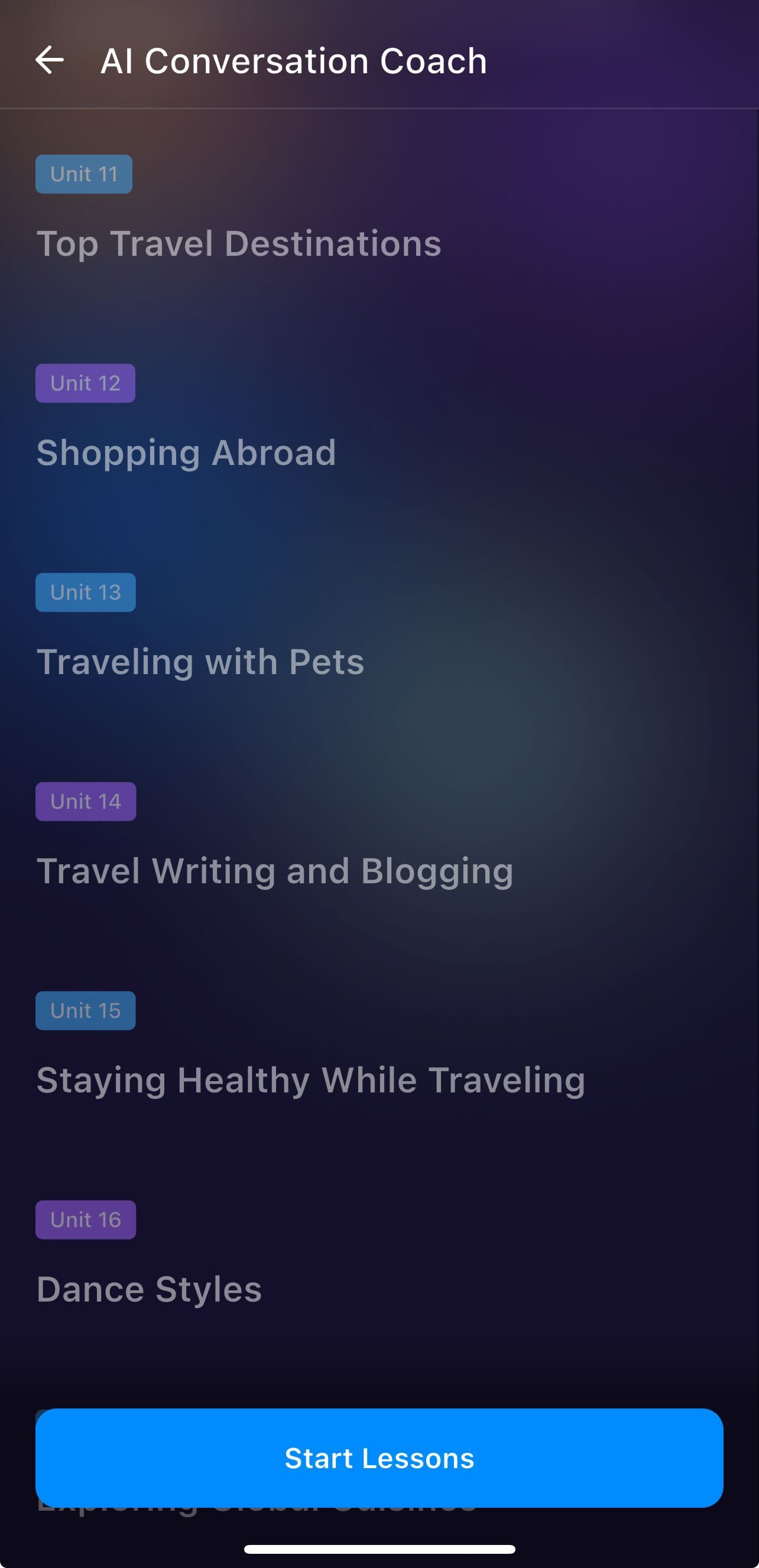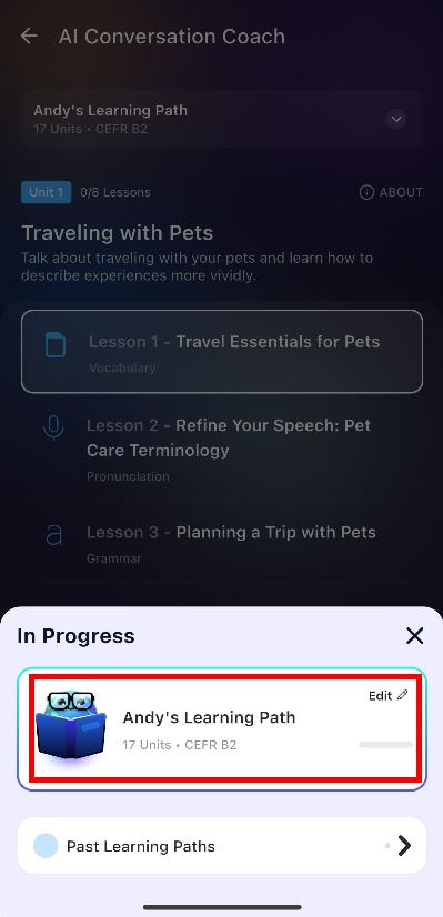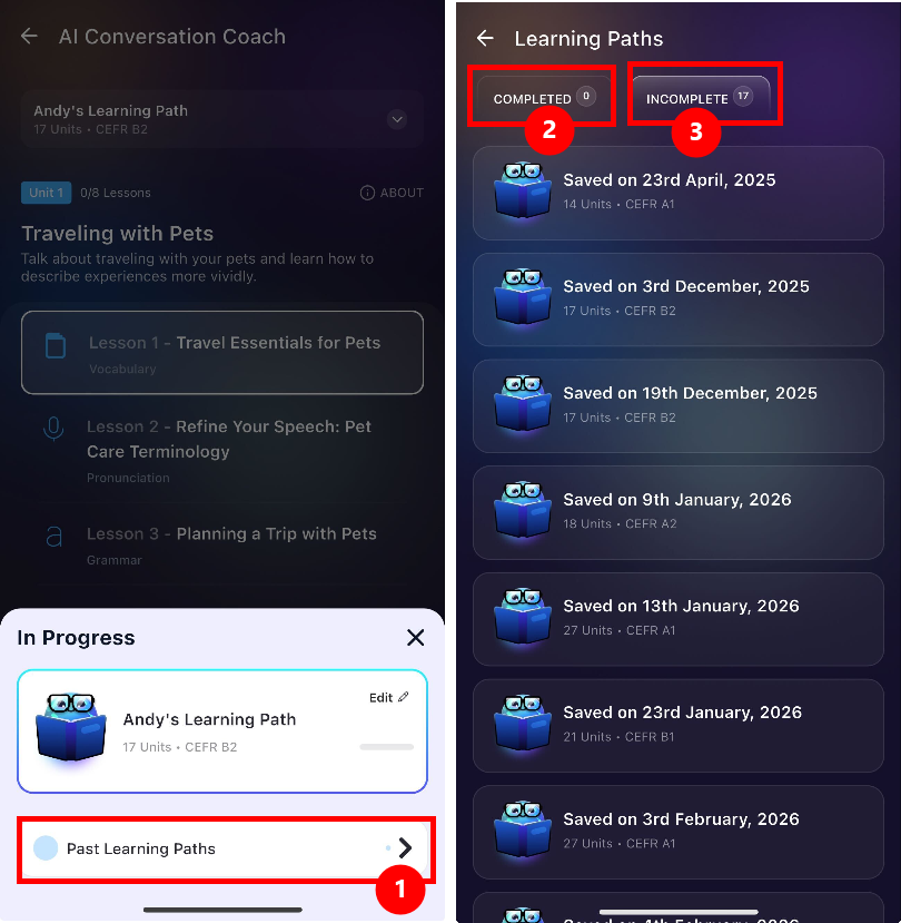 Dengan mengklik "Past Learning Paths" di bagian bawah menu progres Anda saat ini, Anda dapat melihat daftar setiap jalur yang telah Anda buat, termasuk tanggal penyimpanan dan level CEFR spesifik Anda (seperti A1 atau B2).