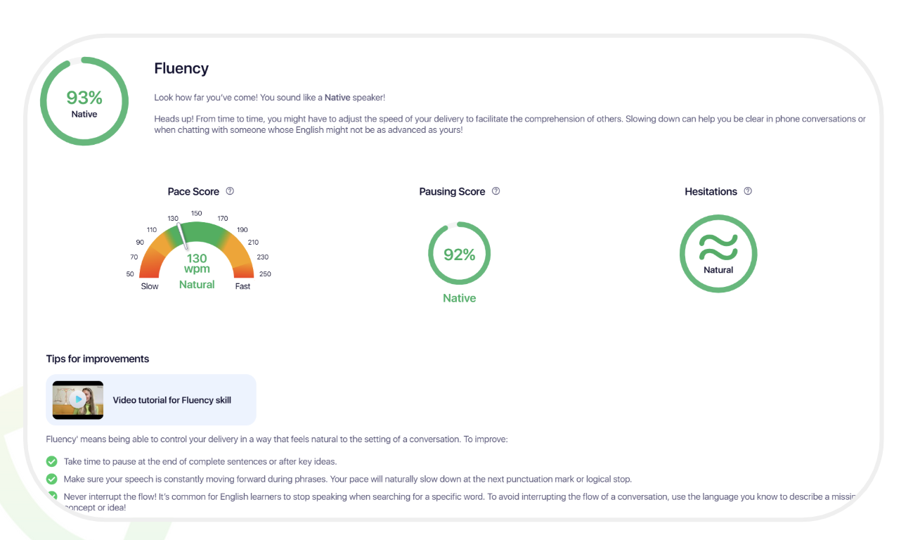 每个录音将包含两种类型的反馈:基于国际英语考试的基准分数和ELSA的整体口语评分。