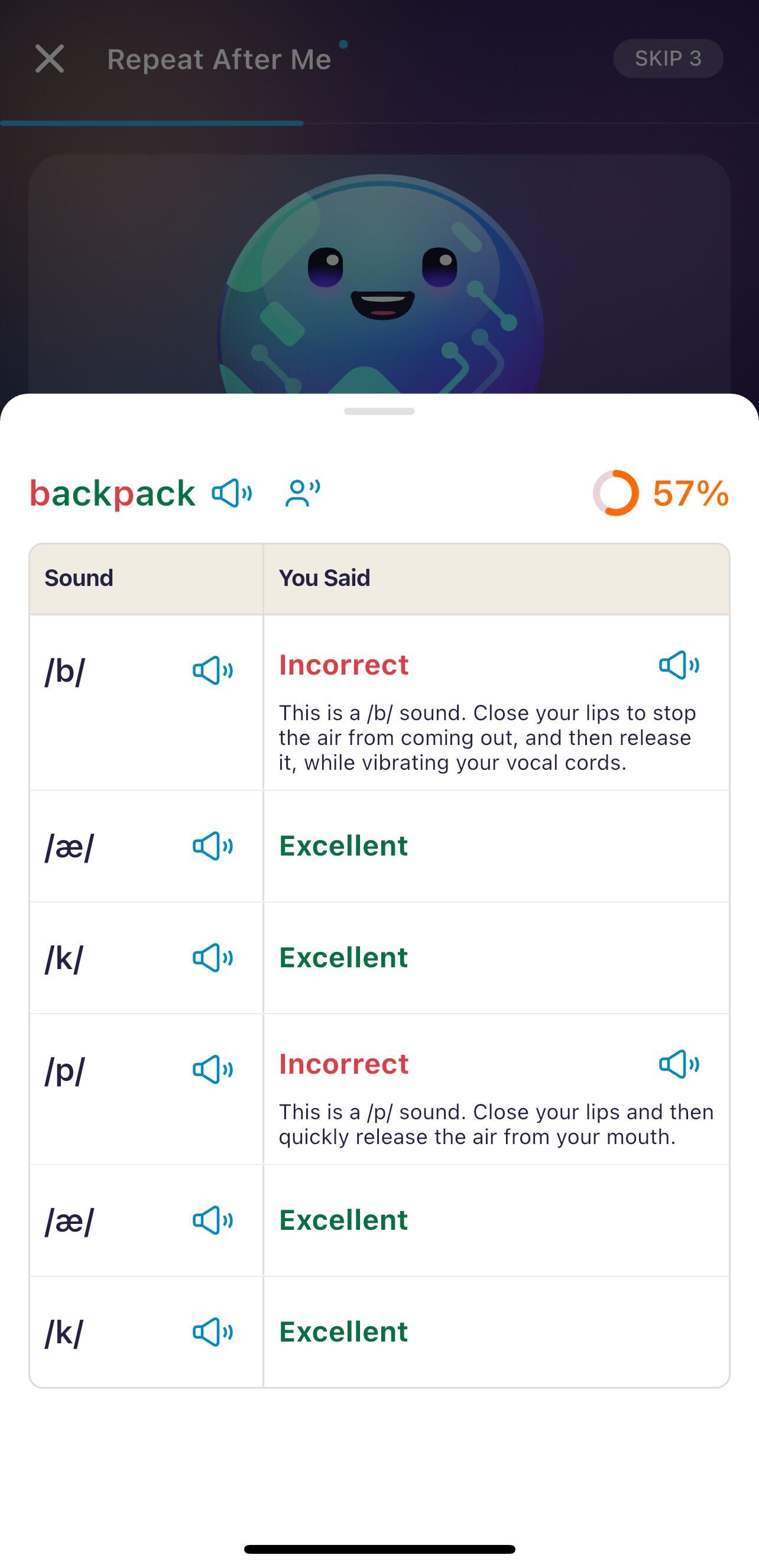 當學習者理解該音所需的口腔動作(例如 /b/ 需要聲帶震動,而 /p/ 只需氣流),請點擊重試圖示再次錄音。
